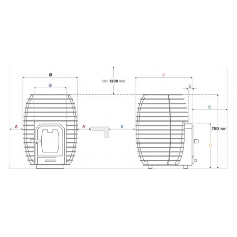 - Ohutuskaugused: A 500 mm, B 500 mm, C 1000 mm, D 460 mm, E 35 mm, F 590 mm, G 300 mm, Ø 555 mm